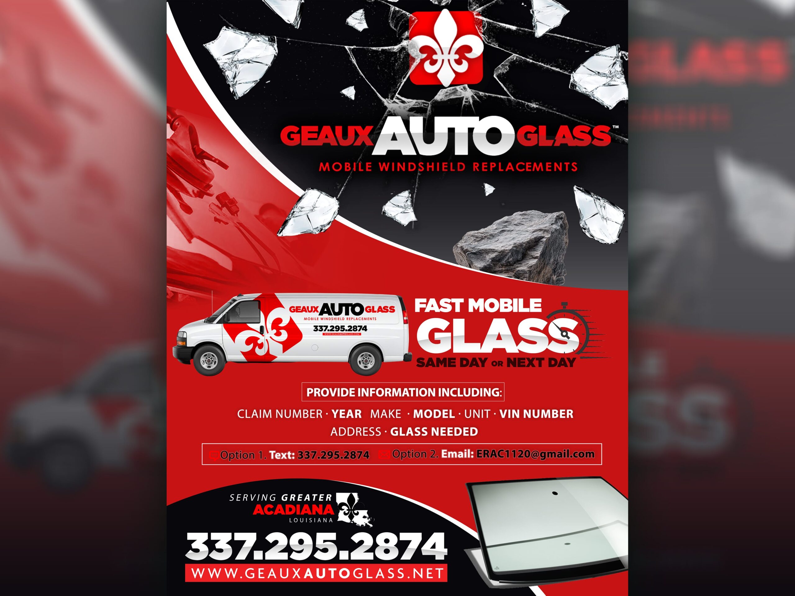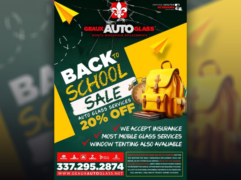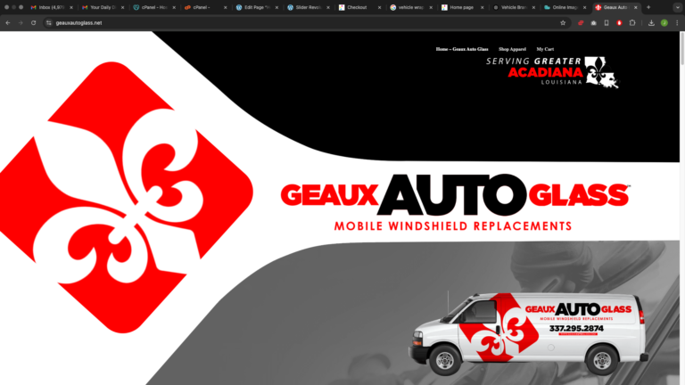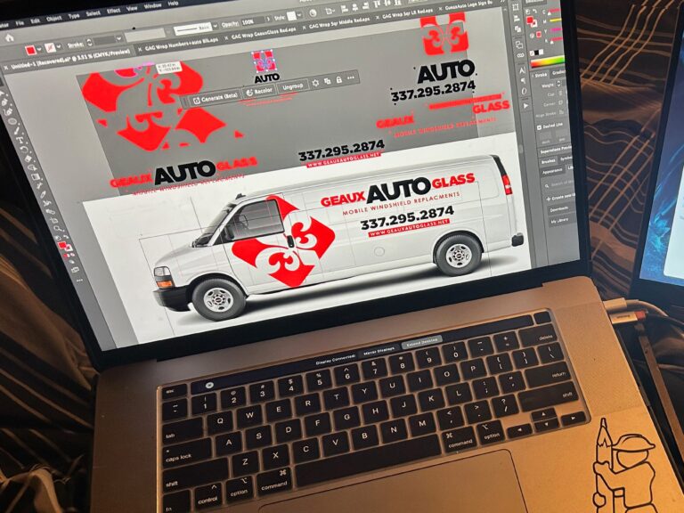 For Geaux Auto Glass, we built a bold, mobile-friendly brand centered on speed, clarity, and trust. The visual identity features clean, modern typography with a sharp, glass-inspired icon. We designed and fabricated storefront signage for high visibility and brand recognition. Fleet vehicle wraps were developed as rolling billboards—bright, legible, and unmistakably Geaux. Complementary ad materials, both print and digital, reinforce the brand’s message of fast, reliable service across every touchpoint.